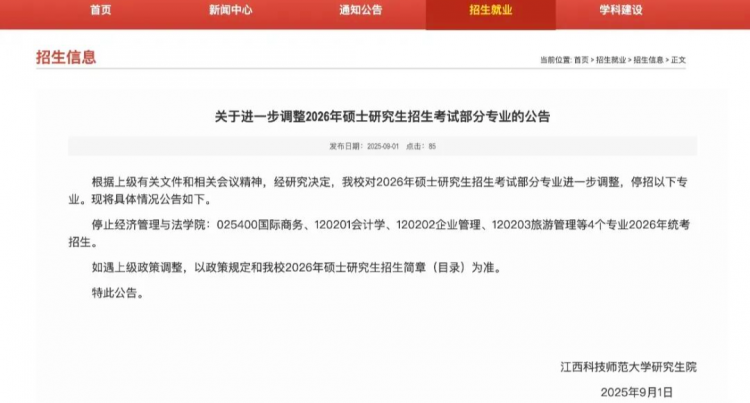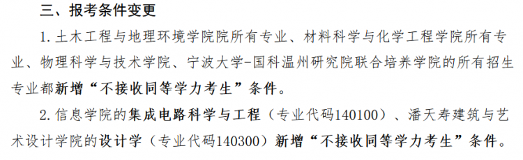 近期各大院校更新招生消息,除初试科目调整外,报考前提改变动需关心。部门院校调整报考资历,如宁波大学多个学院及专业新增“不领受划一学力考生”前提,武汉体育学院、南京体育学院对体育相关专业报考的本科专业及跨考前提有明白。同时,地方平易近族大学部门专业采纳全日制和非全日制隔年招朝气制。教育部数据显示高校学科专业布点优化调整,多所高校“动刀”调整考研专业。专业调整源于新兴范畴人才缺口及裁减低质专业。26考研人应关心报考政策,方针专业停招可看测验科目能否沉合,新增专业或无机会,读研也需关心行业动态,此次调整是时代机比来各大院校都正在更新招生消息,除了初试科目调整之外,改变报考前提才更让人解体!可能间接需要我们调整方针院校和专业。当然,我们从院校官宣的改考通知中,也能够看到26考研调整的风向!今天小编就带着大师一路来看一下~1、土木匠程取地舆学院院所有专业、材料科学取化学工程学院所有专业、物理科学取手艺学院、宁波大学-国科温州研究院结合培育学院的所有招生专业都新增“不领受划一学力考生”前提。2、消息学院的集成电科学取工程(专业代码140100)、潘天寿建建取艺术设想学院的设想学(专业代码140300)新增“不领受划一学力考生”前提。