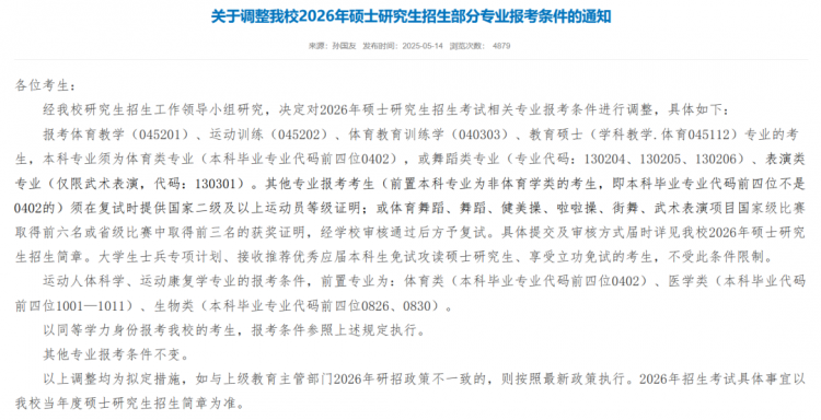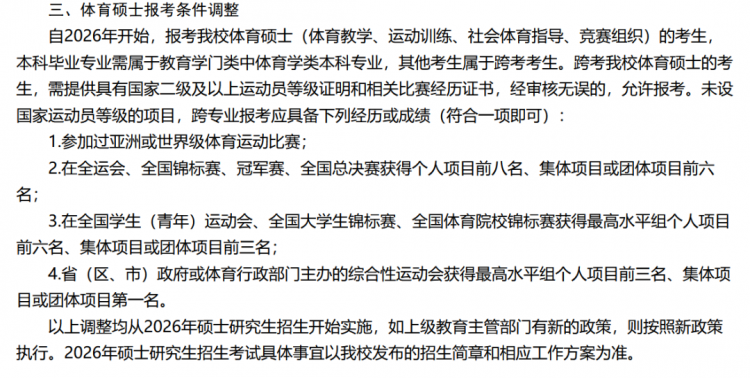 自2026年起头,报考武汉体育学院体育硕士(体育讲授、社会体育指点、竞赛组织)的考生,本科结业专业需属于教育学门类中体育学类本科专业,其他考生属于跨考考生。跨考我校体育硕士的考生,经审核无误的,答应报考。未设国度活动员品级的项目,跨专业报考应具备下列履历或成就(合适一项即可):3、正在全国粹生(青年)活动会、全国体育院校锦标赛获得最高程度组小我项目前六名、集体项目或集体项目前三名;4、省(区、市)或体育行政部分从办的分析性活动会获得最高程度组小我项目前三名、集体项目或集体项目第一名。