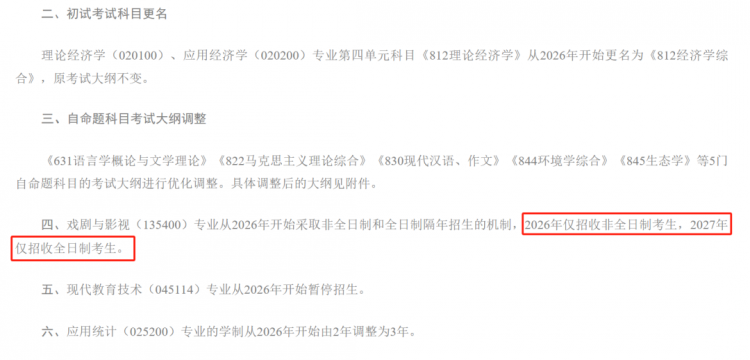 除此之外,大师也必然要关心好本人报考院校及专业全日制及非全日制环境。由于,有部门院校采用的是全日制和非全日制的隔年招朝气制。好比地方平易近族大学的戏剧取影视(135400)专业从2026年起头采纳非全日制和全日制隔年招生的机制,2026年仅招收非全日制考生,2027年仅招收全日制考生。