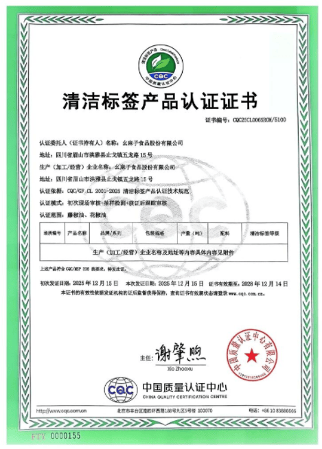 近日,幺麻子食物股份无限公司的藤椒油取花椒油系列产物,成功获得“洁净标签产物认证”0级认证。
