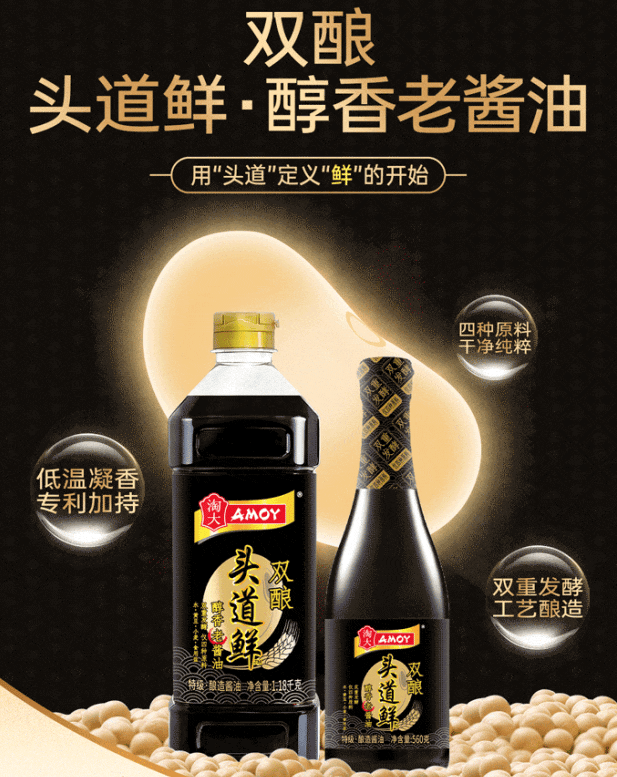 淘大超等新品——双酿头道鲜醇喷鼻老酱油正式上市,天然醇喷鼻,天然陈色。仅利用水、非转基因黄豆、小麦、食用盐4种原料酿制,不添加味精、焦糖色、美味剂、防腐剂,取淘大鲜喷鼻黄豆酱油比拟钠含量削减29%。