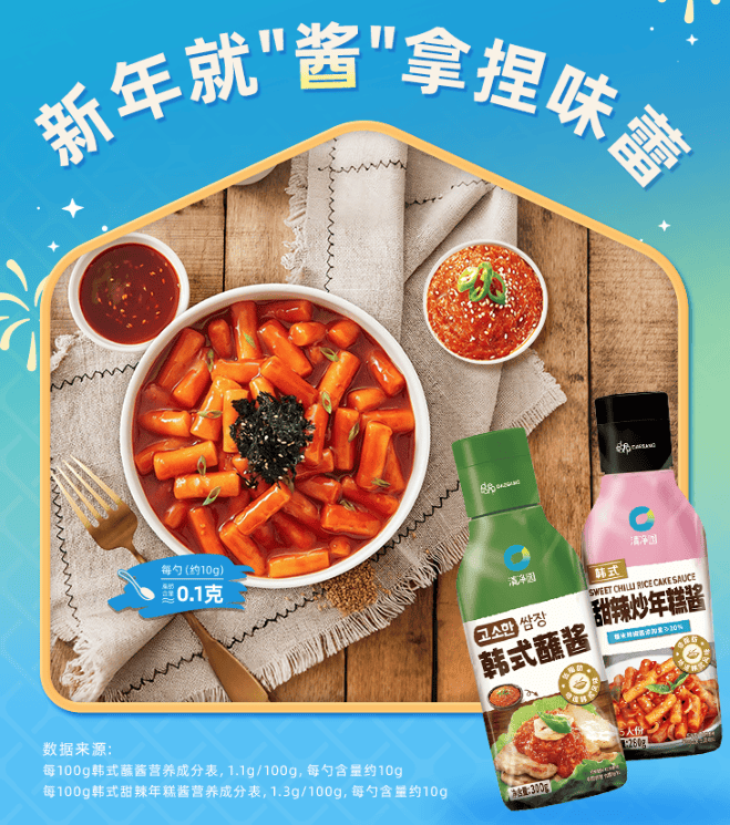 新年焕新,园韩式蘸酱&甜辣炒年糕酱上线。韩式蘸酱延续韩式典范工艺,复刻地道甘旨挤挤瓶设想,控量不净手;甜辣炒年糕酱,添加≧20%糯米辣椒酱,甜辣比例刚好炒年糕、拌面、煮拉面……一勺韩味活力。这两款产物合用于蘸、拌、炒、厨房小白也能轻松复刻韩剧同款美食。