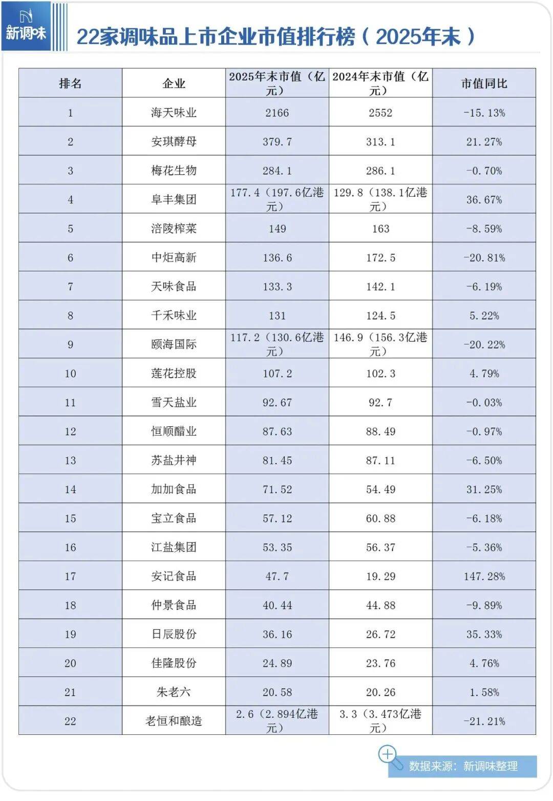 2025年尘埃落定,调味品本钱市场的成就单也正式揭晓。新调味清点了2025岁暮22家调味品上市企业(含A股、港股)的市值,并以人平易近币为单元从高到低进行呈现。