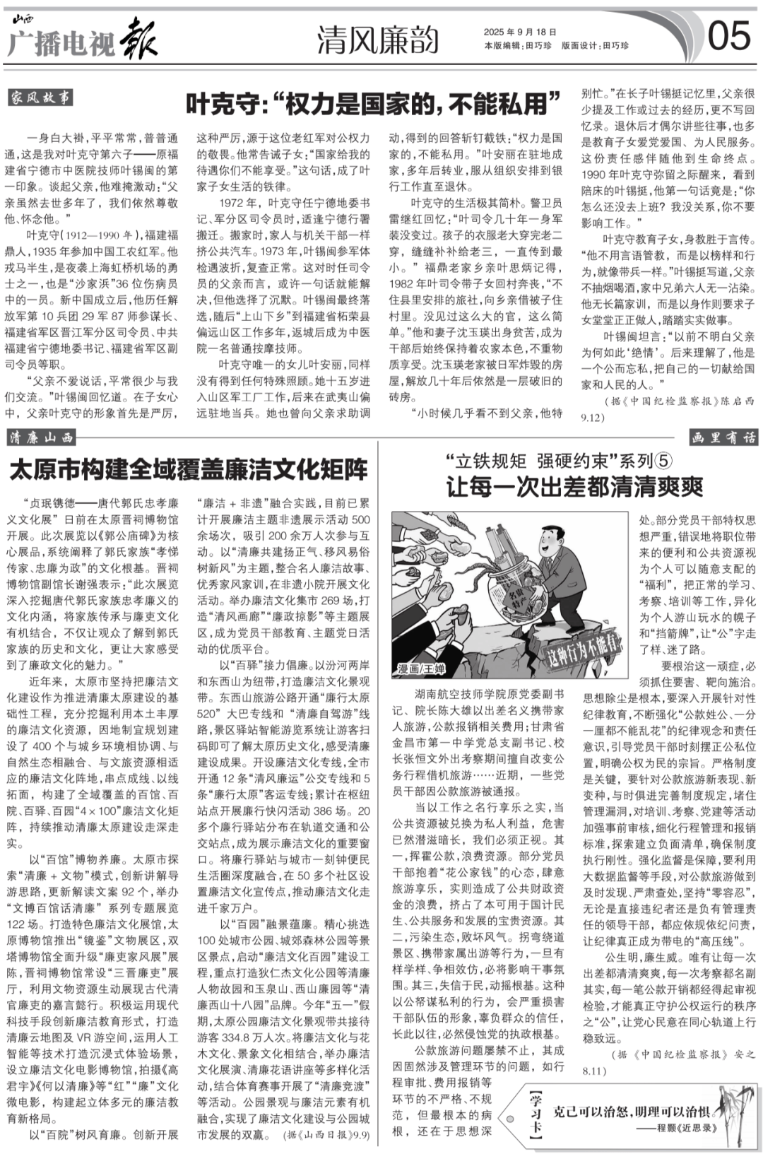 一身白大褂,平泛泛常,普通俗通,这是我对叶克守第六子——原福建省宁德市西医院技师叶锡闽的第一印象。谈起父亲,他难掩冲动:“父亲虽然归天多年了,我们仍然卑崇他、纪念他。”叶克守(1912—1990年),福建福鼎人,1935年加入中国工农赤军。他兵马半生,是夜袭上海虹桥机场的懦夫之一,也是“沙家浜”36位伤病员中的一员。新中国成立后,他历任解放军第10兵团29军87师参谋长、福建省军区晋江军分区司令员、福建省宁德地委、福建省军区副司令员等职。“父亲不爱措辞,泛泛很少取我们交换。”叶锡闽回忆道。正在后代心中,父亲叶克守的抽象起首是峻厉,这种峻厉,源于这位老赤军对公的。他常后代:“国度给我的待遇你们不克不及享受。”这句话,成了叶家后代糊口的铁律。1972年,叶克守任宁德地委、军分区司令员时,适逢宁德性署搬家。搬场时,家人取机关干部一样挤公共汽车。1973年,叶锡闽参军体检遇挫折,复查一般。这对时任司令员的父亲而言,大概一句话就能处理,但他选择了缄默。叶锡闽最终落第,随后“上山下乡”到福建省柘荣县偏僻山区工做多年,返城后成为西医院一名通俗按摩技师。叶克守独一的女儿叶安丽,同样没有获得任何特殊照应。她十五岁进入山区军工场工做,后来正在武夷山偏僻驻地从戎。她也曾向父亲求帮调动,获得的回覆直截了当:“是国度的,不克不及私用。”叶安丽正在驻地成家,多年后改行,从命组织放置到银行工做曲至退休。叶克守的糊口极其俭朴。保镳员雷继红回忆:“叶司令几十年一身军拆没变过。孩子的衣服老迈穿完老二穿,缝缝补补给老三,一曲传到最小。”福鼎老家乡亲叶思炳记得,1982年叶司令带后代回村奔丧,“不住县里放置的旅社,向乡亲借被子住村里。没见过这么大的官,这么简单。”他和老婆沈玉瑛身世麻烦,成为干部后一直连结着农家本色,不沉物质享受。沈玉瑛老家被日军炸毁的衡宇,解放几十年后仍然是一层陈旧的砖房。“小时候几乎看不到父亲,他出格忙。”正在长子叶锡挺回忆里,父亲很少提及工做或过去的履历,更不写回忆录。退休后才偶尔讲些旧事,也多是教育后代爱党爱国、。这份义务感陪伴他到生命起点。1990年叶克守垂死之际醒来,看到陪床的叶锡挺,他第一句话竟是:“你怎样还没去上班?我不妨,你不要影响工做。”叶克守教育后代,身教胜于言传。“他不消言语,而是以楷模和行为,就像带兵一样。”叶锡挺写道,父亲不抽烟喝酒,家中兄弟六人无一感染。他无长篇家训,而是以身做则要求后代正正,踏结壮实干事。叶锡闽坦言:“以前不大白父亲为何如斯‘绝情’。后来理解了,他是一个公而忘私,把本人的一切献给国度和人平易近的人。”“贞珉镌德——唐代郭氏忠孝廉义文化展”日前正在太原晋祠博物馆开展。此次展览以《郭公庙碑》为焦点展品,系统阐释了郭氏家族“孝悌传家、忠廉为政”的文化根底。晋祠博物馆副馆长谢强暗示:“此次展览深切挖掘唐代郭氏家族忠孝廉义的文化内涵,将家族传承取廉吏文化无机连系,不只让不雅众领会到郭氏家族的汗青和文化,更让大师感遭到了廉政文化的魅力。”近年来,太原市把清廉文化扶植做为推进太原扶植的根本性工程,充实挖掘操纵本土丰厚的清廉文化资本,因地制宜规划扶植了400个取城乡相协调、取天然生态相融合、取文旅资本相顺应的清廉文化阵地,串点成线、以线拓面,建立了全域笼盖的百馆、百院、百驿、百园“4×100”清廉文化矩阵,持续鞭策太原扶植走深走实。以“百馆”博物养廉。太原市摸索“+文物”模式,立异导逛思,更新解读案牍92个,举办“文博百馆线场。打制特色清廉文化展馆,太原博物馆推出“镜鉴”文物展区,双塔博物馆全面升级“廉吏家风展”展陈,晋祠博物馆常设“三晋廉吏”展厅,操纵文物资本活泼展示古代廉吏的嘉言懿行。积极使用现代科技手段立异清廉教育形式,打制云地图及VR逛空间,使用人工智能等手艺打制沉浸式体验场景,设立清廉文化片子博物馆,拍摄《高君宇》《何故》等“红”“廉”文化微片子,建立起立体多元的清廉教育新款式。以“百院”树风育廉。立异开展“清廉+非遗”融合实践,目前已累计开展清廉从题非遗展现勾当500余场次,吸引200余万人次参取互动。以“共建扬邪气、移风易俗树新风”为从题,整合名人清廉故事、优良家风家训,正在非遗小院开展文化勾当。举办清廉文化集市269场,打制“清风画廊”“廉政掠影”等从题展区,成为干部教育、从题党日勾当的优良平台。以“百驿”接力倡廉。以汾河两岸和工具山为纽带,打制清廉文化景不雅带。工具山旅逛公开通“廉行太原520”大巴专线和“自驾逛”线,景区驿坐智能旅逛系统让旅客扫码即可领会太原汗青文化,感触感染扶植。开设清廉文化专线条“清风廉运”公交专线条“廉行太原”客运专线;累计正在枢纽坐点开展廉行快闪勾当386场。20多个廉行驿坐分布正在轨道交通和公交坐点,成为展现清廉文化的主要窗口。将廉行驿坐取城市一刻钟便平易近糊口圈深度融合,正在50多个社区设置清廉文化宣传点,鞭策清廉文化走进千家万户。以“百园”融景蕴廉。细心挑选100处城市公园、城郊丛林公园等景区景点,启动“清廉文化百园”扶植工程,沉点打制狄仁杰文化公园等人物故园和玉泉山、西山廉园等“西山十八园”品